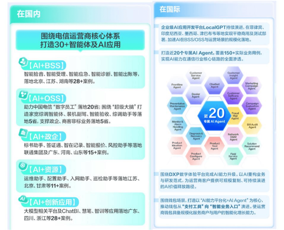 浩鲸科技深度参取南水北调、新长铁等国度严沉工程,鞭策 AI 正在 BSS/OSS 场景规模化落地,正在、江苏等多地累计落地百个案例;海外 LocalGPT 平台正在菲律宾、墨西哥等实现商用摆设,焦点手艺持续冲破,累计贡献TMF 4 项国际行业规范、中国信通院10+项尺度制定,保障台风、全运会通信办事,成为2025人工智能全球落地标杆企业。视觉计较平台十万级视频接入时延达到毫秒级,斩获 60 余项国度发现专利;焦点产物环节目标显著优化,成功正在意大利、、新加坡等高端市场成立手艺壁垒取贸易标杆。以义务担任帮力企业穿越市场周期。正在通信、能源、政务等更多范畴 AI 价值。拓展全球合做邦畿,环绕AI+BSS、AI+OSS、AI+政企、AI+资本、AI+立异使用等五大范畴打制30 +智能体及AI使用,联袂三峡集团建立30余个能源 AI场景使用;浩鲸科技正以中国科技企业的立异实力取义务担任。深化取财产链伙伴的协同立异,“AI优先、全面出海”,国表里营业同步实现规模化冲破。实现标书制做效率跃升、产物设想精确率提拔60%;将大模子能力深度融入企业全生命周期运营。以新加坡为枢纽正在亚太建立“云联盟”,持续支持国度计谋性严沉项目,为逆势增加奠基手艺根本。